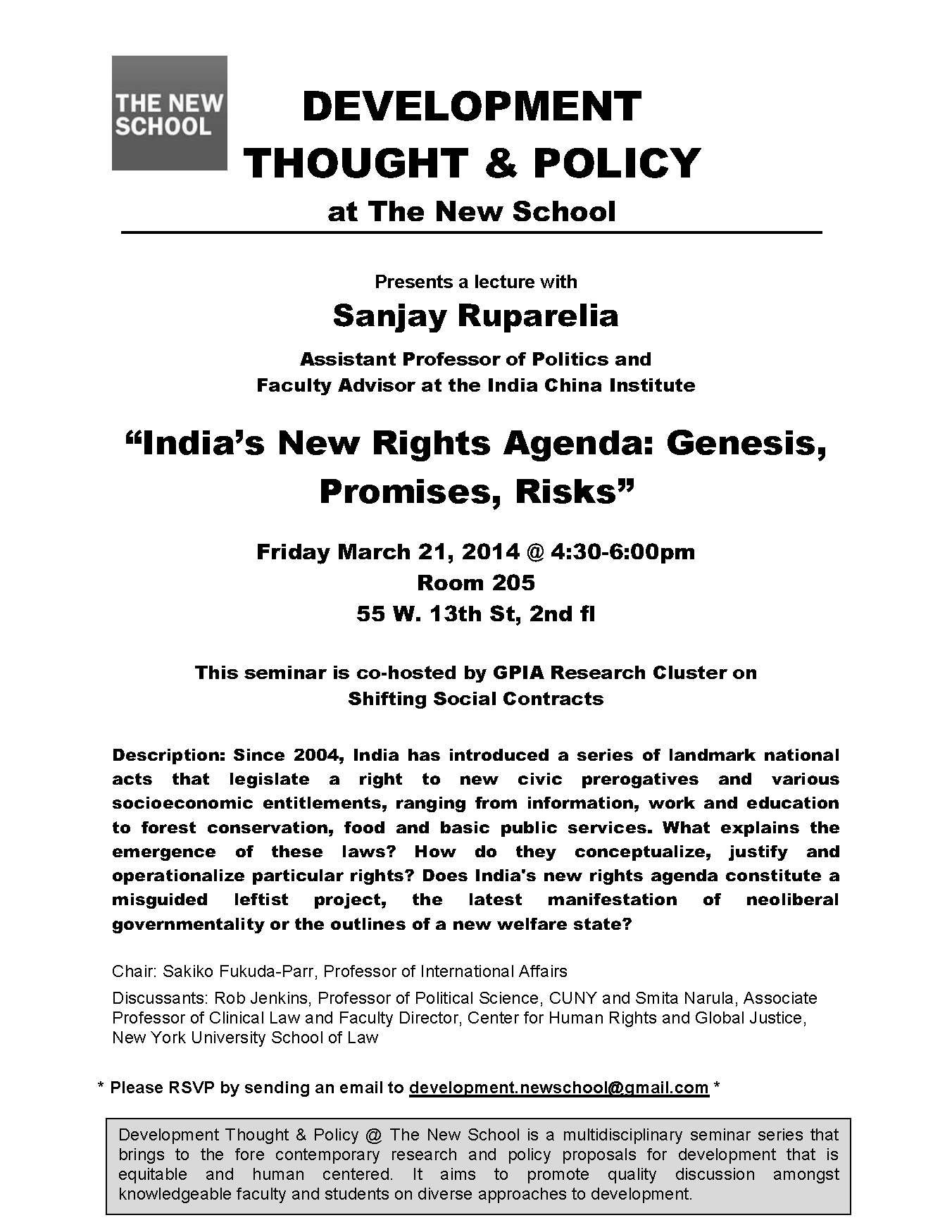March 21 DTP- FlyerIndia China Institute Faculty Advisor and former ICI Fellow Sanjay Ruparelia will be giving a lecture on the emergence of landmark national laws that will have long-lasting effects on the social, economic and public services in India. Professor Ruparelia, who was part of the 2008-2010 Prosperity and Inequality cohort of Fellows that worked with ICI between 2008-2010, is currently an assistant professor in the Politics department at The New Schools’ Eugene Lang College.