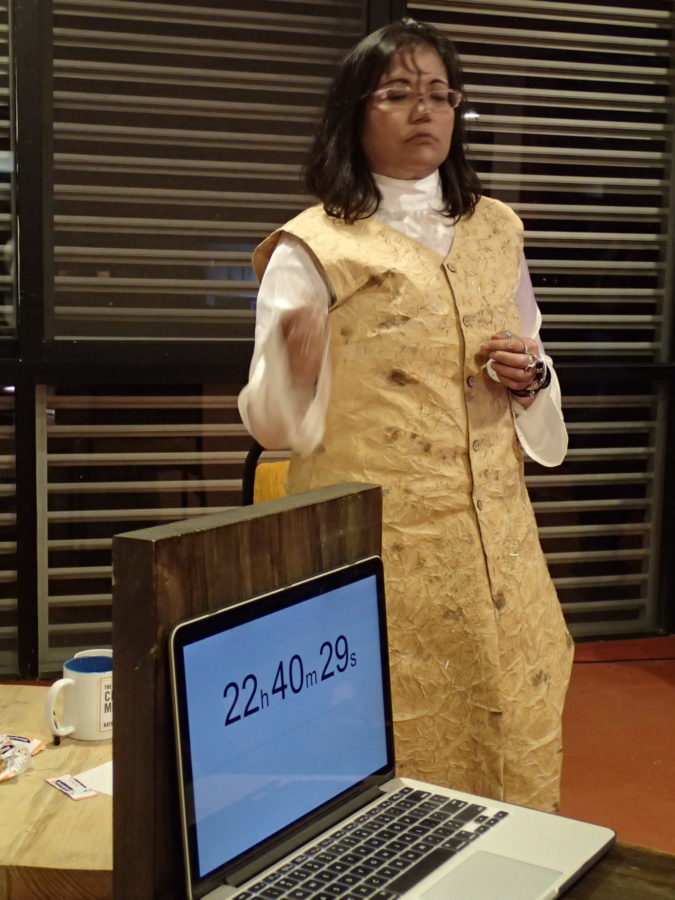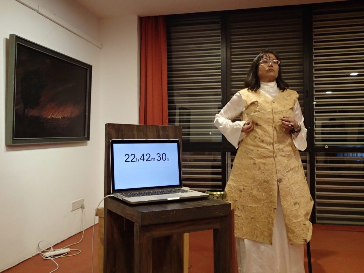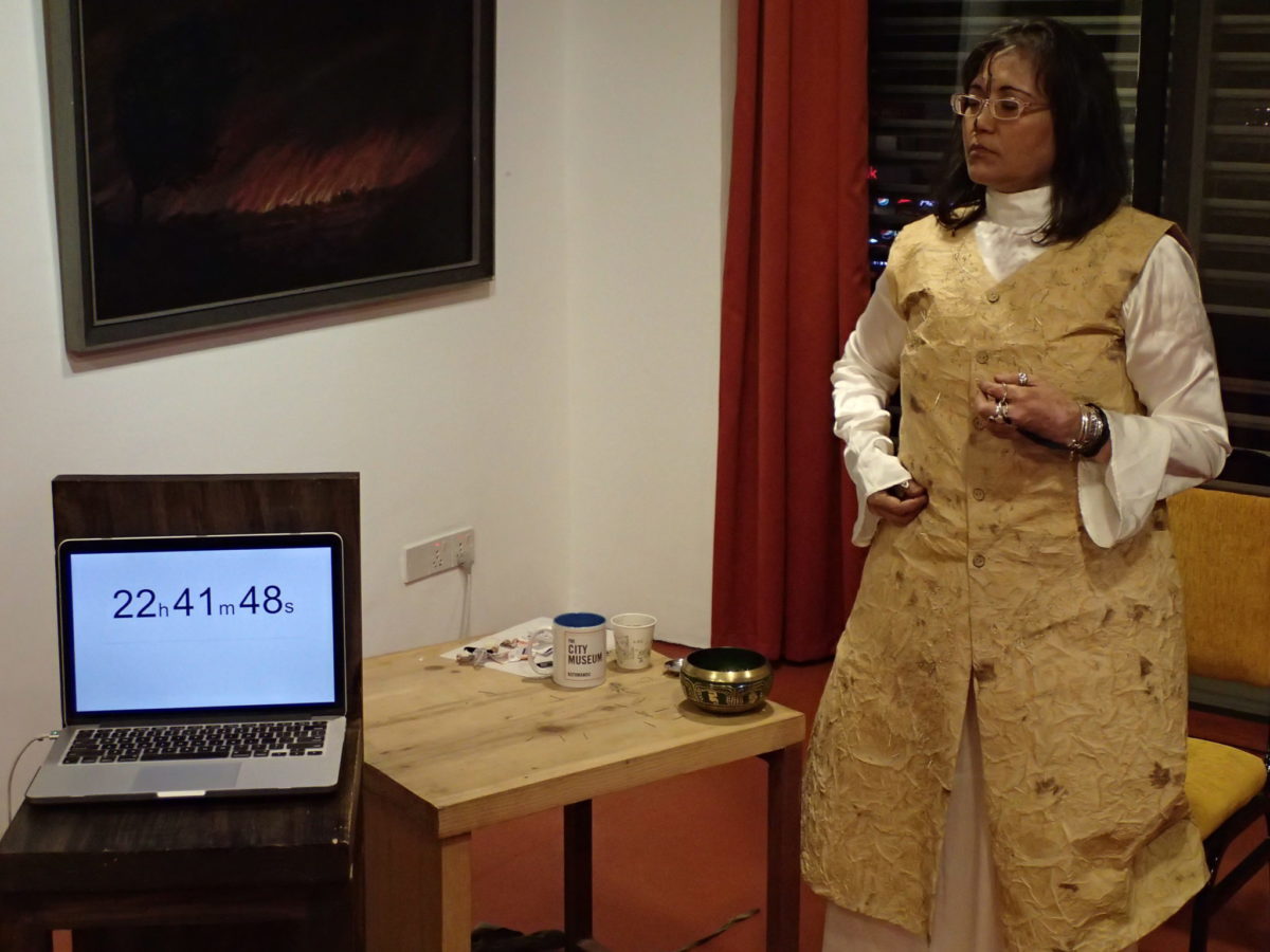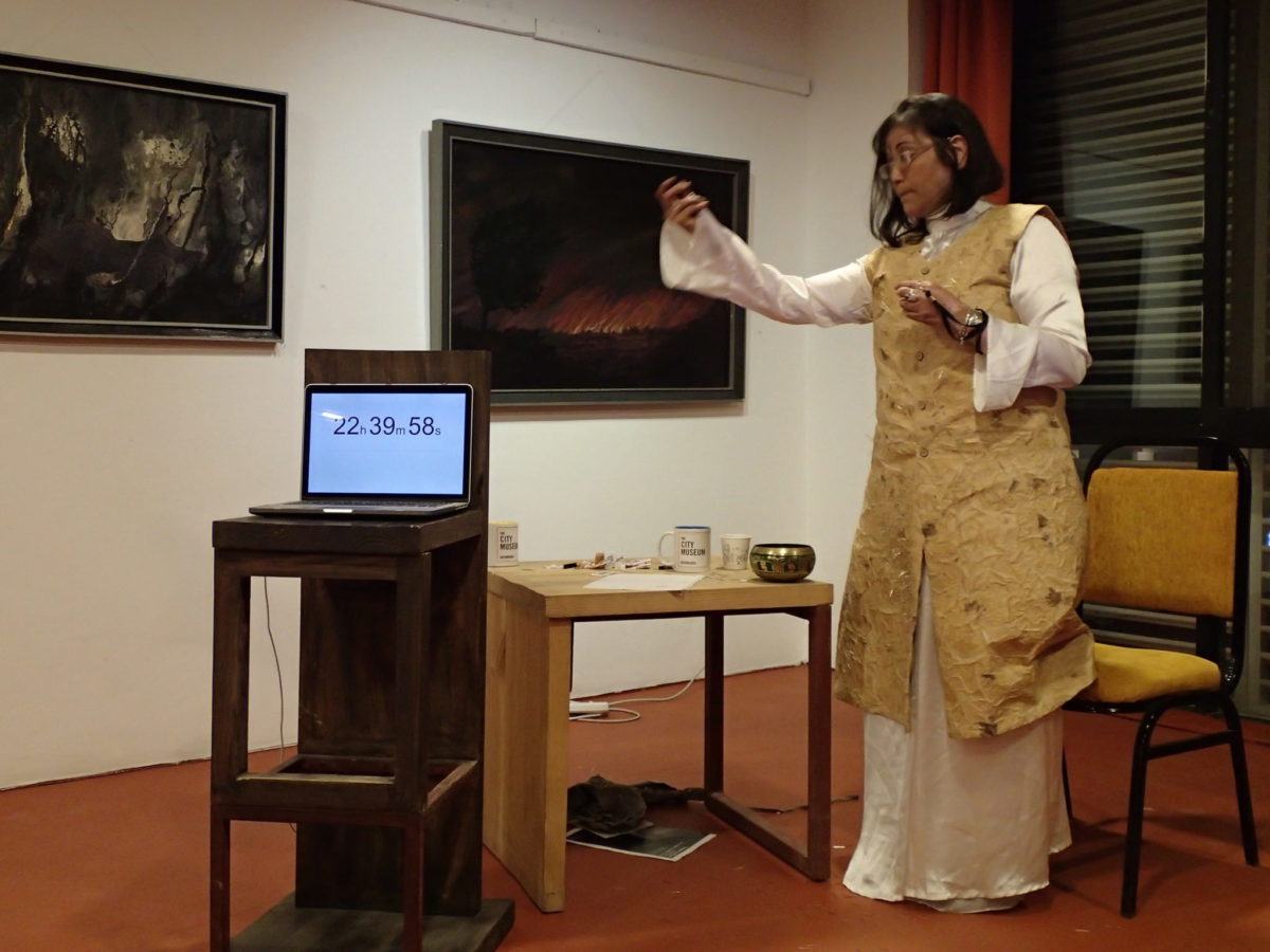 Following this discussion, everyone quickly jumped up and the space was re-arranged and returned to its original gallery form. From there the evening performance by Ashmina Ranjit, and the art work of her father KG Ranjit, got into full swing.
