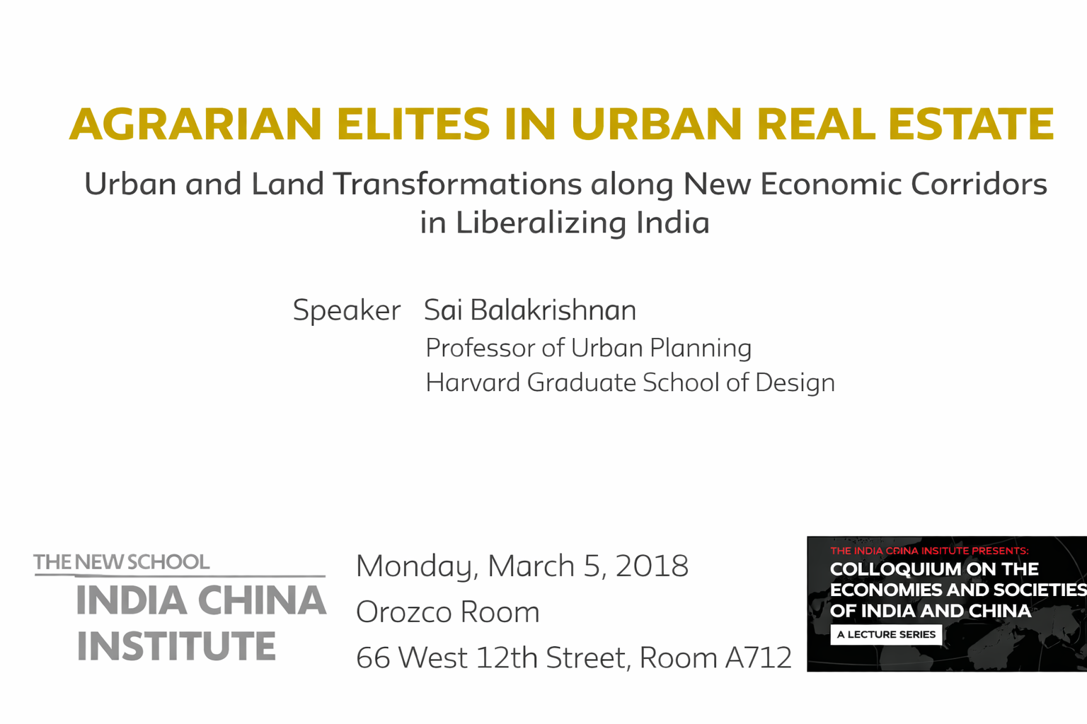 Professor Sai Balakrishnan will be exploring the narrative movements of urbanization in contemporary India from megacities to the contested geographies along new economic corridors. As policymakers search for new market-oriented means for the transfer of land from agrarian constituencies to infrastructural promoters and urban developers, the re-allocation of property control is erupting into volatile land-based social conflicts. Professor Balakrishnan puts forward the argument that some of India’s most decisive conflicts over its urban futures will unfold in these corridor regions where electorally strong agrarian propertied classes are coming into direct encounters with financially powerful incoming urban firms. She calls for new theories of land and urbanization that are capable of incorporating within them the agrarian political economy. Through focusing on the agrarian to urban land-use change along India’s first economic corridor, the Mumbai-Pune Expressway, she articulates how diverse agrarian property regimes shape the trajectories of contemporary urbanization in liberalizing India.