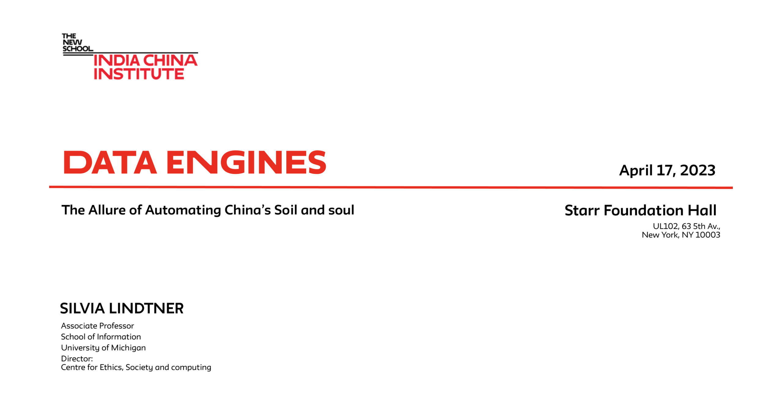 In this talk, Silvia Lindtner will draw from ethnographic research she has conducted over the last 14 months across two sites in China: 1) small-scale businesses that center on alternative food and spiritual practices via life in nature and the countryside and 2) large-scale, data-driven agricultural experiments at the outskirts of major urban centers. Prof. Lindtner will discuss how these two sites interact for the implementation of two recent state policies on “rural revitalization” and “national strengthening.” These policies are aimed at reinvesting into China’s “hinterlands:” from rural farmland to people’s most inner selves. They position data-driven techniques of automation, surveillance technology, and smart systems as key to the state’s ability to manage life that has partially escaped the state’s reach. And they call upon China’s youths who have turned away from the city to live and work in China’s countryside to co-produce what she calls “data engines,” i.e. a participatory form of techno-governance driven by an engineering mindset that aims to cultivate citizens as productive selves who operate on behalf of the party state and its ambition to build a “strong China” by turning inwards—China’s history, soil, and agriculture. Data engines, she shows, simultaneously enable, and slow down the automation of China’s soil and soul.