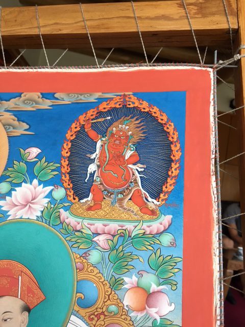 He graciously explained his process of stringing the cotton canvas to the frame, gessoing the surface with a special material, and then working on a grid for the painting. The proportions has to be perfect, otherwise it will cause bad karma for the artist. The best paint is from natural powders and what he actually uses.